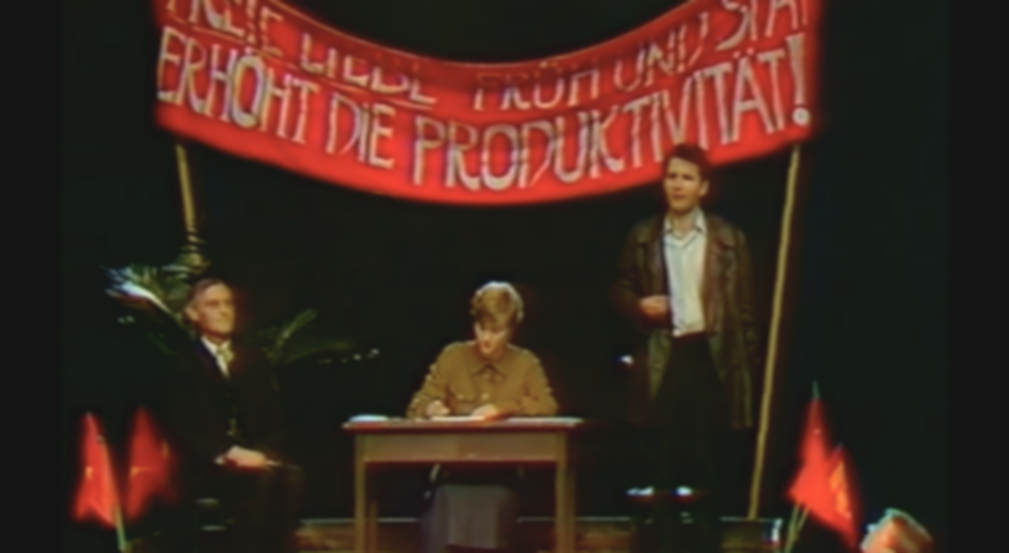 Schroths Inszenierung beginnt auf dem Vorplatz des BE mit Jugendlichen des Jahres 1980. Mopeds knattern, Rockerjacken verströmen zeitgenössisches Revoluzzer-Potential einer Jugend, die mit der alt gewordenen DDR schon nicht mehr so viel verband wie die Komsomolzen mit der jungen Sowjetunion des Jahres 1920. Denen begegnen wir dann im Theater, das sie auf der ganzen Linie bespielen, wo sie in Rängen und Logen ebenso debattieren wie auf der Bühne. Dort befindet sich in seinem Metallbett auch der kranke Lenin – als Symbol für ein krankes System, den Anforderungen der Gegenwart kaum noch gewachsen.